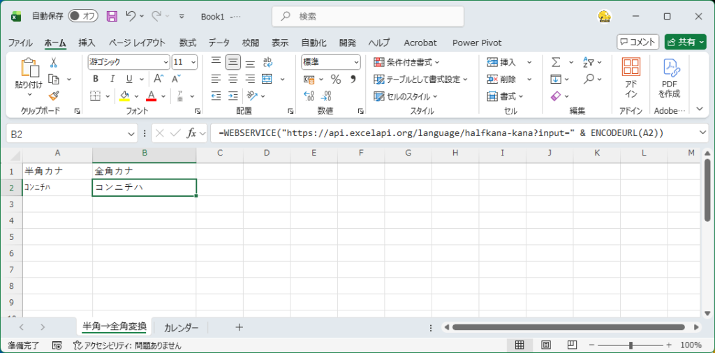 =WEBSERVICE("https://api.excelapi.org/language/halfkana-kana?input=" & ENCODEURL(A2))