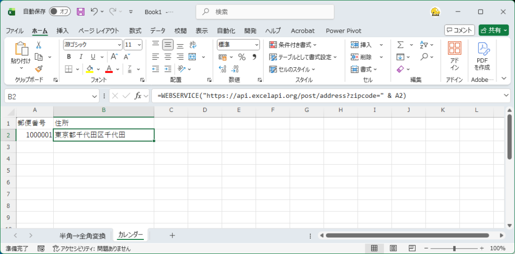 A2セルに郵便番号(ハイフンなし)を入力します。