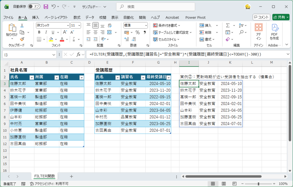 =FILTER(受講履歴,(受講履歴[講習名]="安全教育")*(受講履歴[最終受講日]<=TODAY()-300))