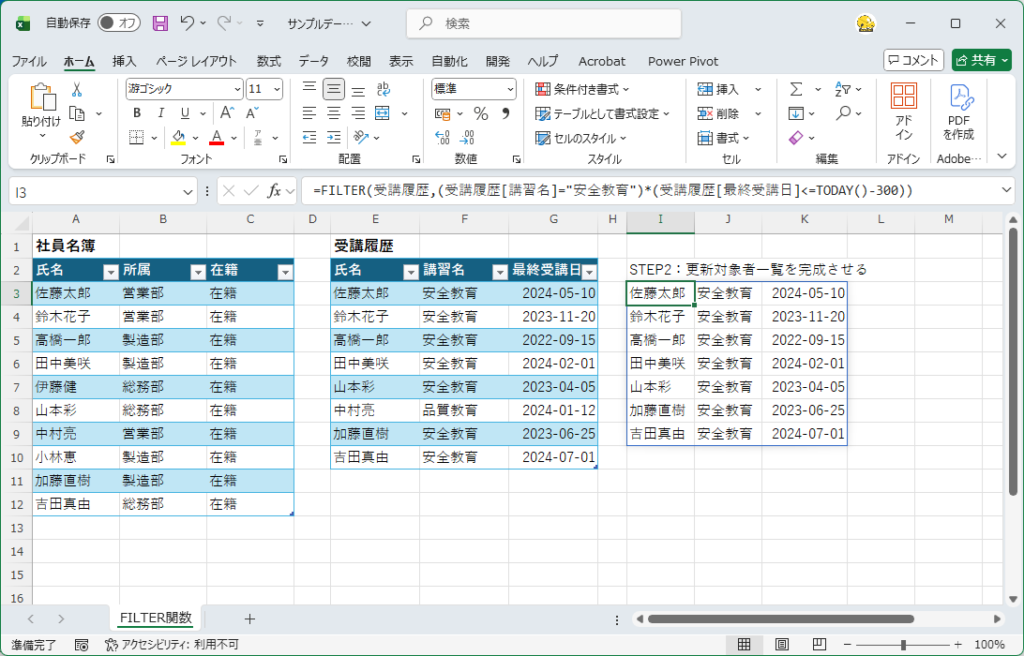 =FILTER(受講履歴,(受講履歴[講習名]="安全教育")*(受講履歴[最終受講日]<=TODAY()-300))